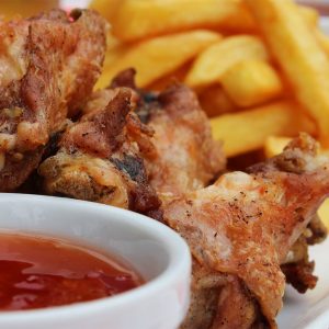 Kis adag 12-14db sült csirke szárny BBQ és édes-chili szósz, hasábburgonya