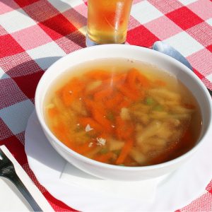 Tyúkhúsleves húsával, csigatésztával és zöldségekkel